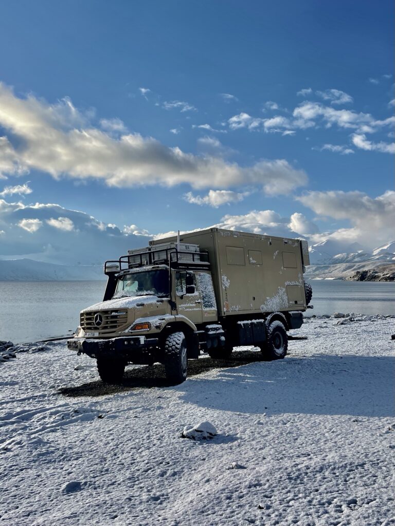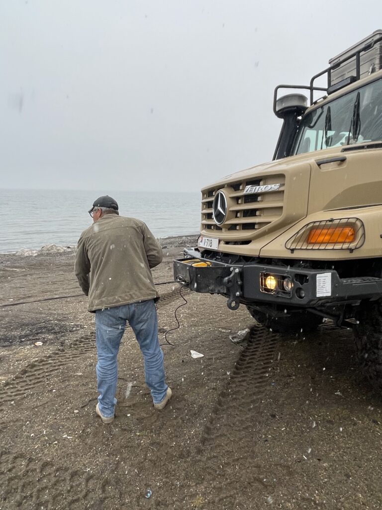We did a little walk through the area, but the cold wind and snow fall, pushed us back in the truck. After a while somebody knocked on the door (normally you would think police or army again). No, now it was somebody who asked for help. A young lovers couple spending some time on the beach in their sedan, got stuck on the beach and couldn’t get out anymore. Too deep in the sand.
