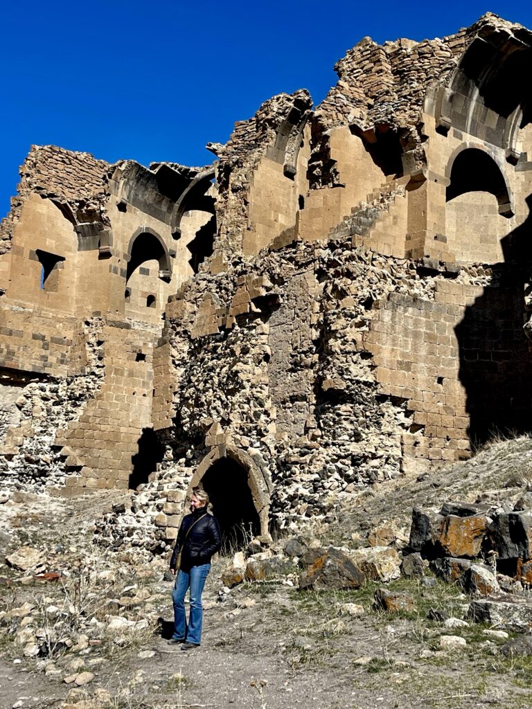 The visitor complex looks deserted with many empty spaces (for shops or food places). There is a small police post and a guy with an electric horse coach like looking vehicle (for driving visitors around the site). The site is far from mayor city centers and it also was not really the time of the year to have many visitors now. But we like that. Ani is a unique place. Due to the presence of many (ruins) churches, it used to be called “the city of thousand churches”. Once a city of almost 200.000 people (in the 10th century AD) on the famous Silk Road, it was the capital of the Armenian Empire and part of the Byzantine Empire. It is also considered as the end of Christianity and start of Islamic Turkey after the conquering by the Seljuks.