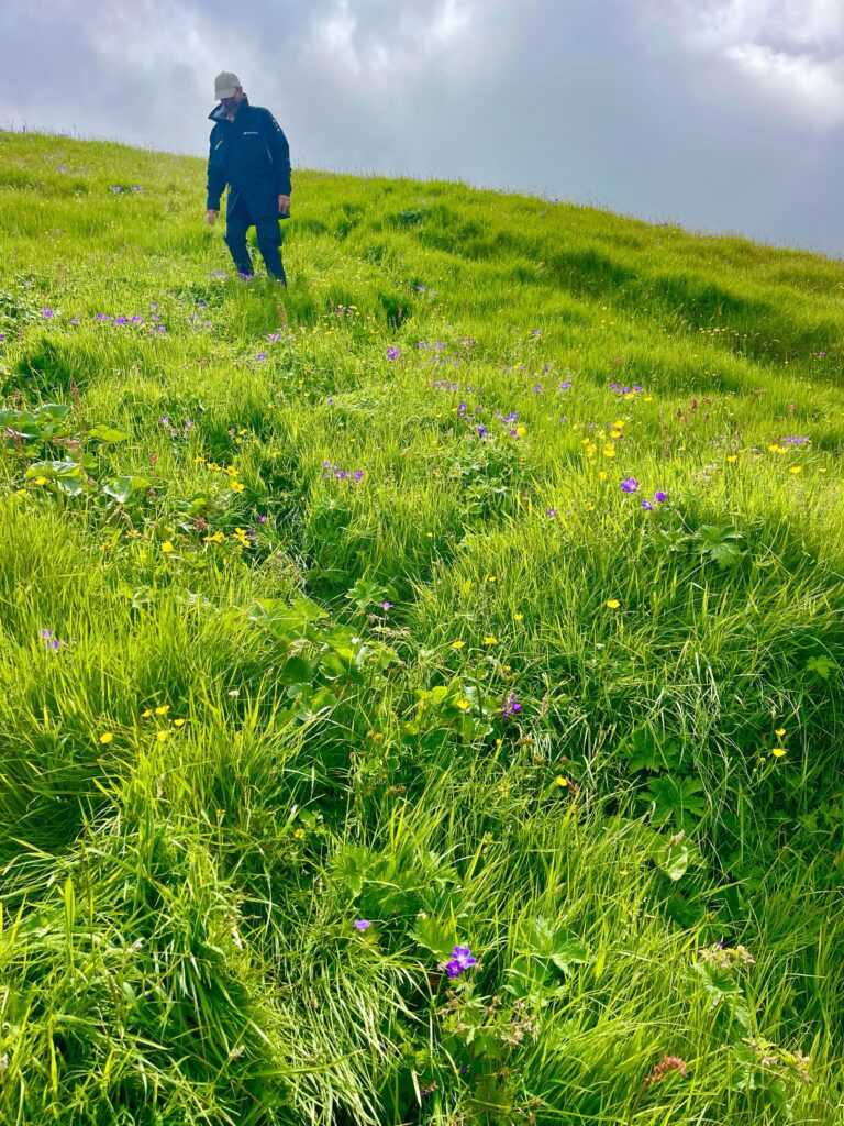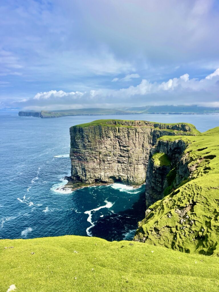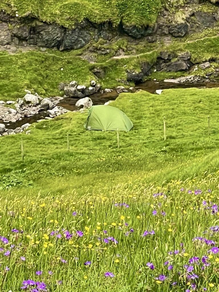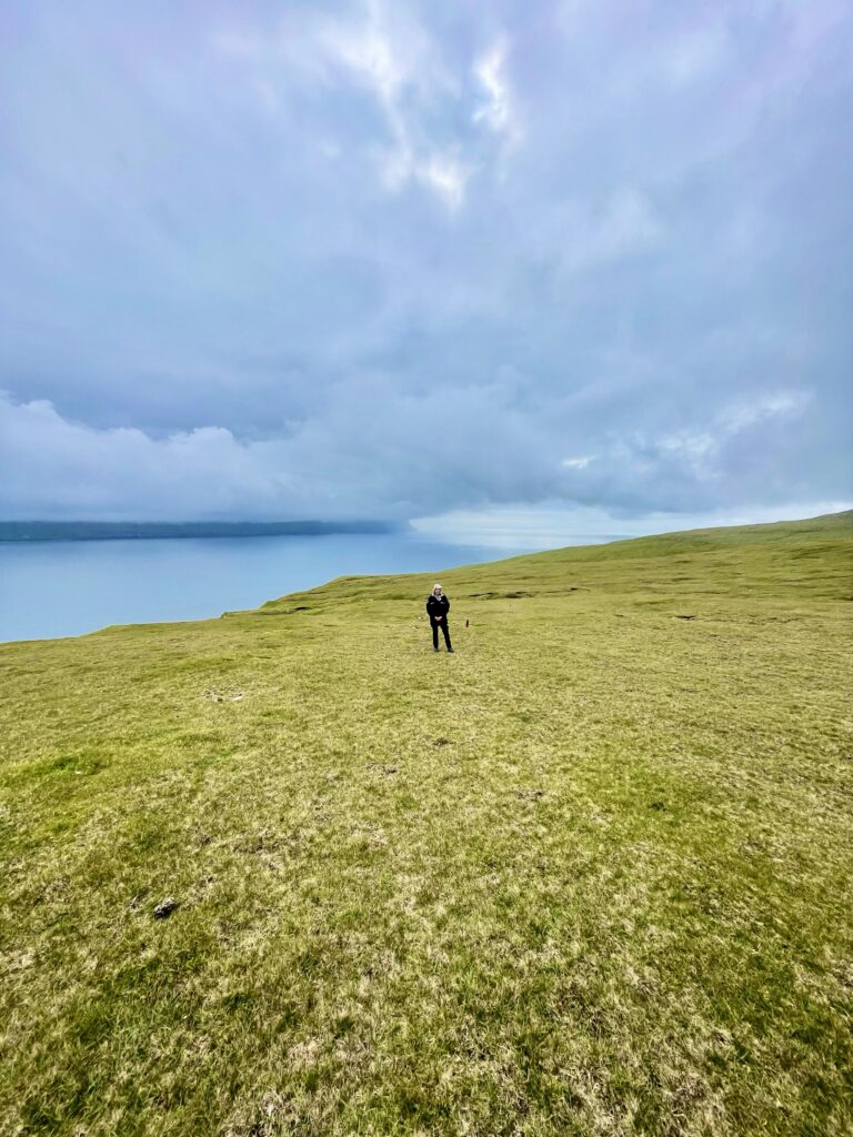 The Faroe Islands are hilly, very hilly, it’s like the Gods lifted large green soccer fields a mere 45 degrees up in the sky, so that their favorite team, always wins, as they can play down hill. And not only that, the ground is soggy! I On top of the rocky underground (made up from basalt rock), an approximate 50cm layer of turf with grass on top, feels like you walk on a sponge. Since it rains about 280 days of the year, the ground never really dries up, hence it stays soggy.