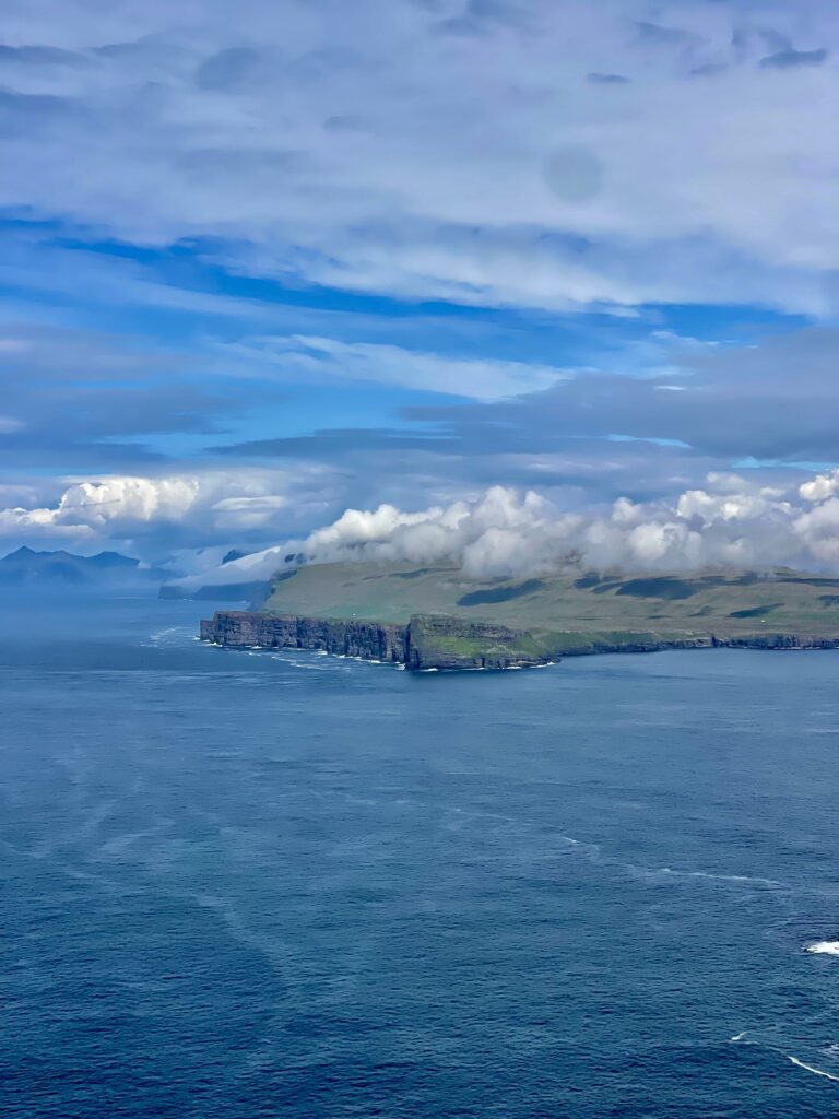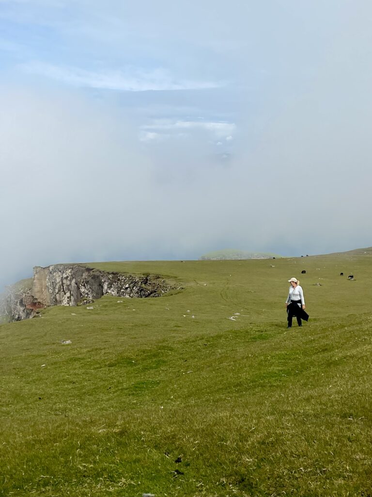 We continued our walk along the cliffs, still all by ourselves only accompanied by the occasional group of sheep. A long stretch we had to go, along a very steep mountain slope hurting our feet and ankles. Now also the fog started to climb up the cliffs and coming down over the slopes on the other side of the cliffs. It was an intriguing sight to see clouds climbing up the cliffs and making a curve going down the slope. It was really like ghosts sliding over the islands.