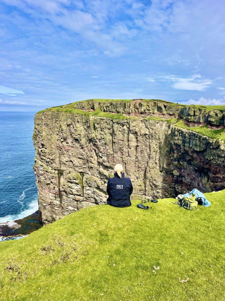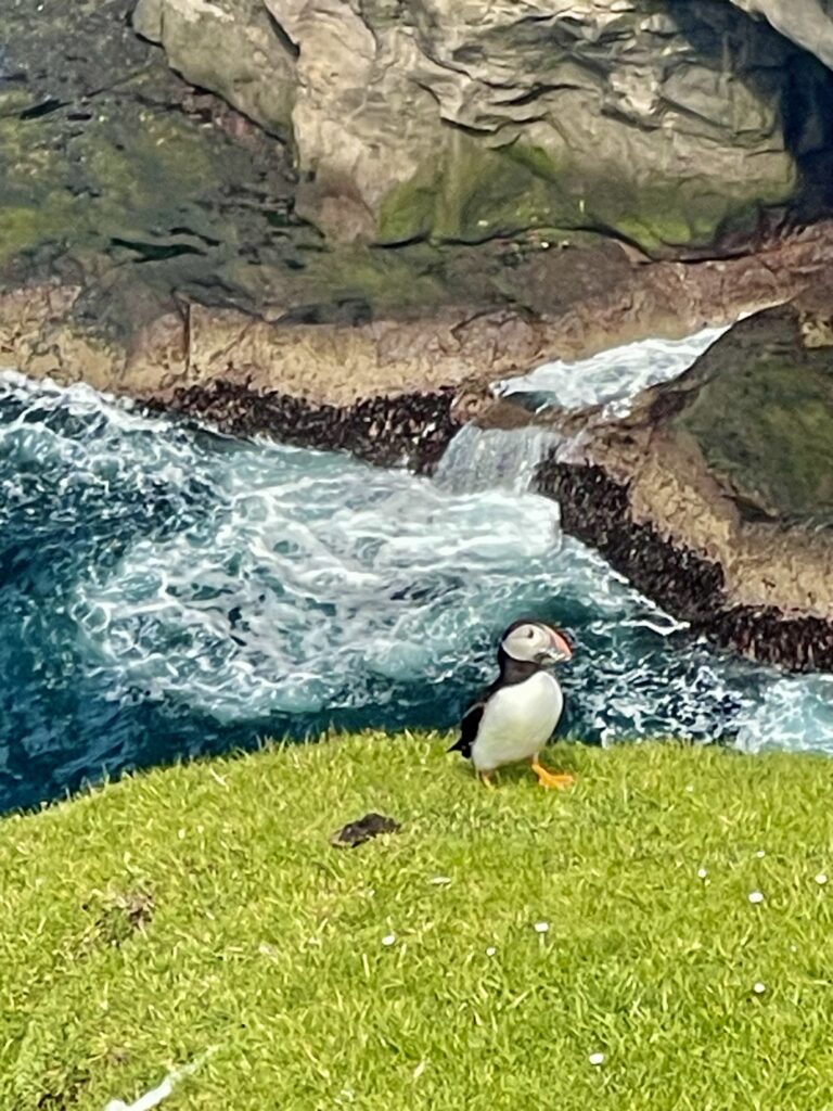 Nearing the shores of Skufoy, we saw the first Puffins swimming in the water. They were much smaller than I had imagined. When they get scared of the arriving vessel, they flip their short little wings, make some steps on the water and fly away, low over the water, or if the vessel is too close, they dive underwater (if I they don’t see them, they don’t see me….)