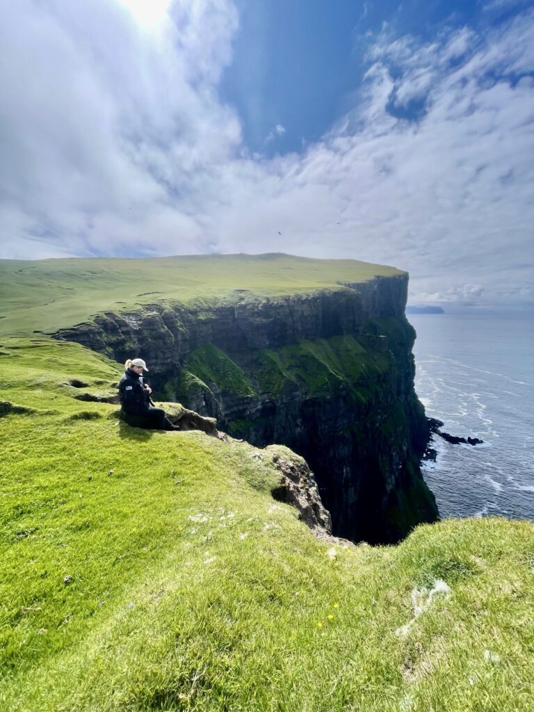 Our goal was to reach a huge cliff where the famous Puffins have a large nesting colony. After a good two hour walk, passing an impressive valley with many Faroese sheep, we reached the edges of an opposite cliff with a great view on the cliff with the nesting birds. Thousands and thousands of birds are flying up and down between the sea and the cliff. Even more are resting and nesting in the face of the cliff. Besides the Puffins there are the thousands of Seagulls and others.