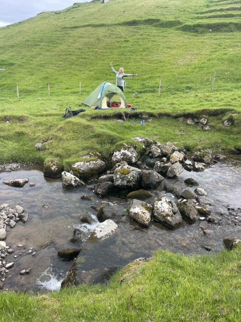 After setting up our camp (we were proud to be able to put up a tent again), we made a walk through the small town, which was separated in two by the small stream. On one side there was one house, the church, graveyard, helicopter port and an industrial building for processing the sheep wool. On the other side the rest of all the houses and the old school, which were connected by two roads. Most of the homes are second homes owned by Faroese living on other islands. It is the get-away or family holiday place.