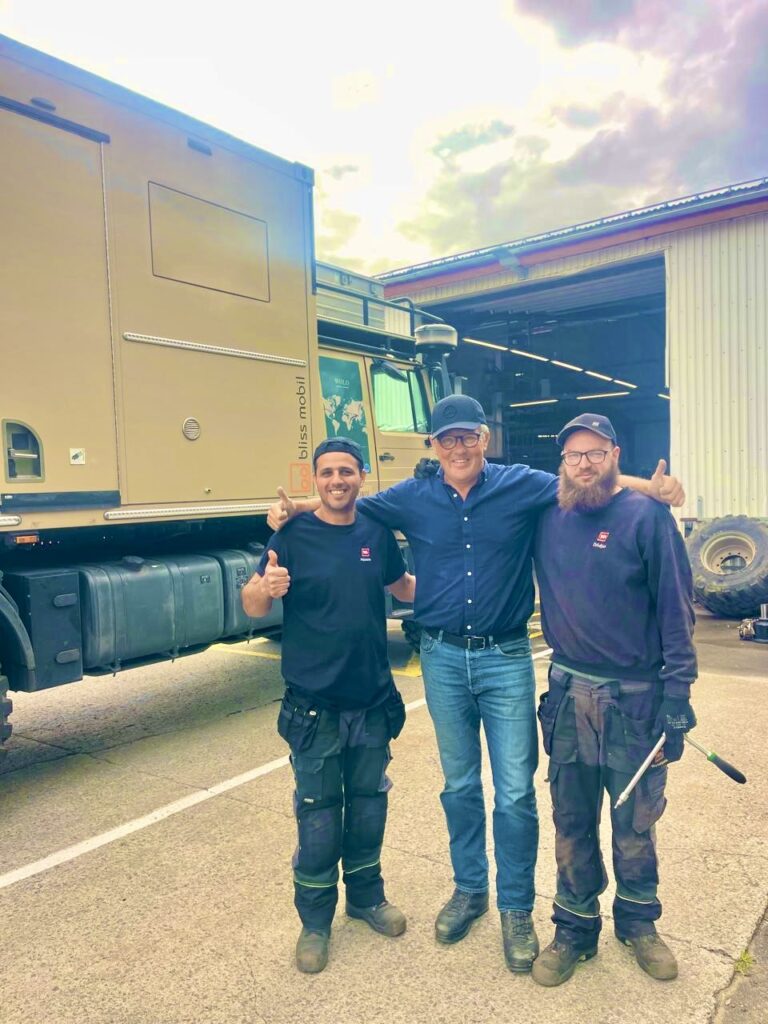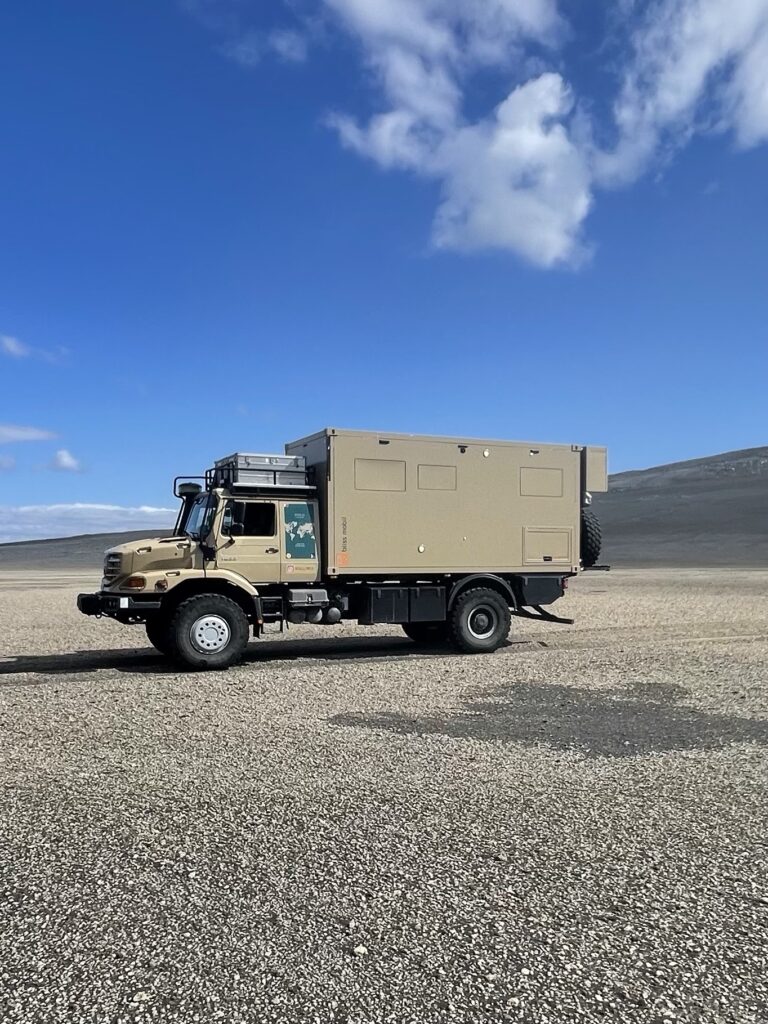 Jon was not finished helping us! He asked if we had a place to camp that night, since he owns a big plot of land with a forest, where he has his caravan parked and where he plans to build his new house. So we drove to this spot and it was excellent. We parked the truck and had some coffee inside. Jon – as a pilot – is close to his retirement. And from the beginning I was wondering why he was so interested in the details of our truck. Visiting his son’s workshop, he actually showed me the reason. A big brand new 6×6 Scania truck, with a “naked” chassis was parked in the large workshop. He has plans to build his own camper truck! He even visited the Bliss booth during a camper show in Germany, so he was fully aware of the existence of our kind of camper trucks.