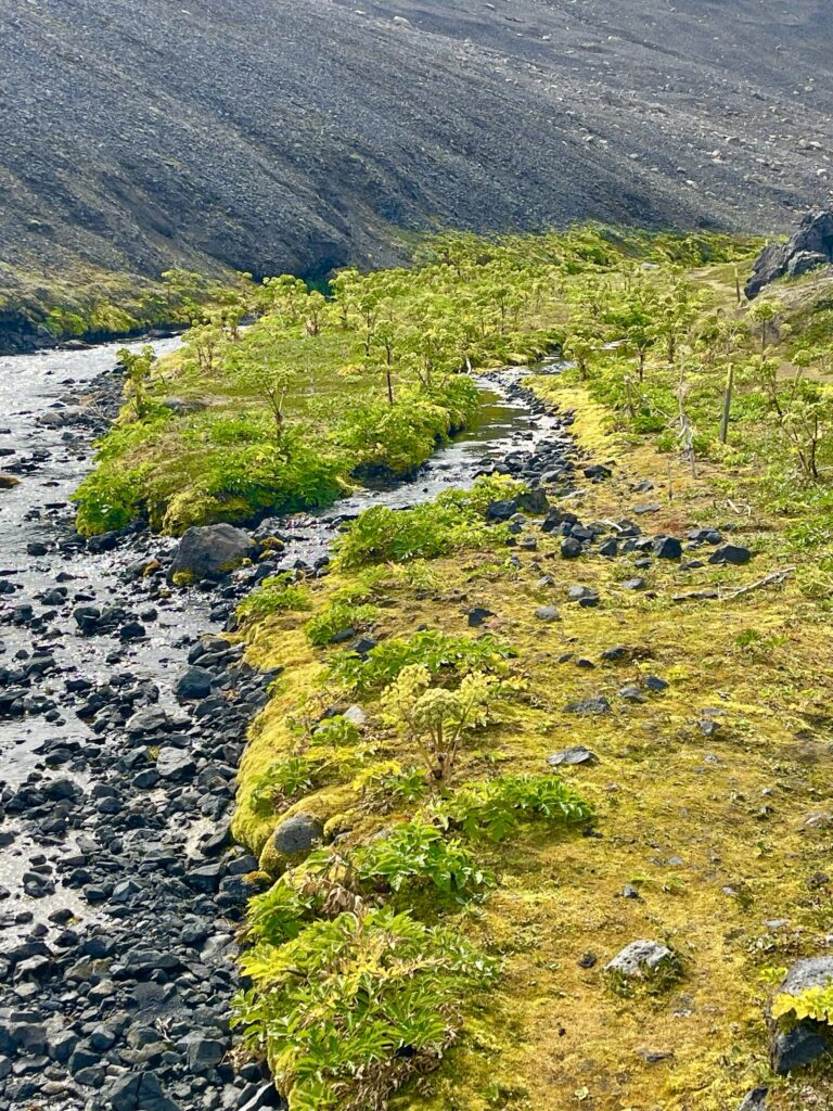 A cold water well bubbles up at several spots, creating a lake and a river flowing into the desert. Rich mineral water, which allows many plants, mosses and flowers to grow, turning this small area into a small garden of Eden, within a black and grey rough world. A popular stop over for the Pink footed goose and other birds. From hot mud to chrystal clean cold water, mother earth keeps surprising us.