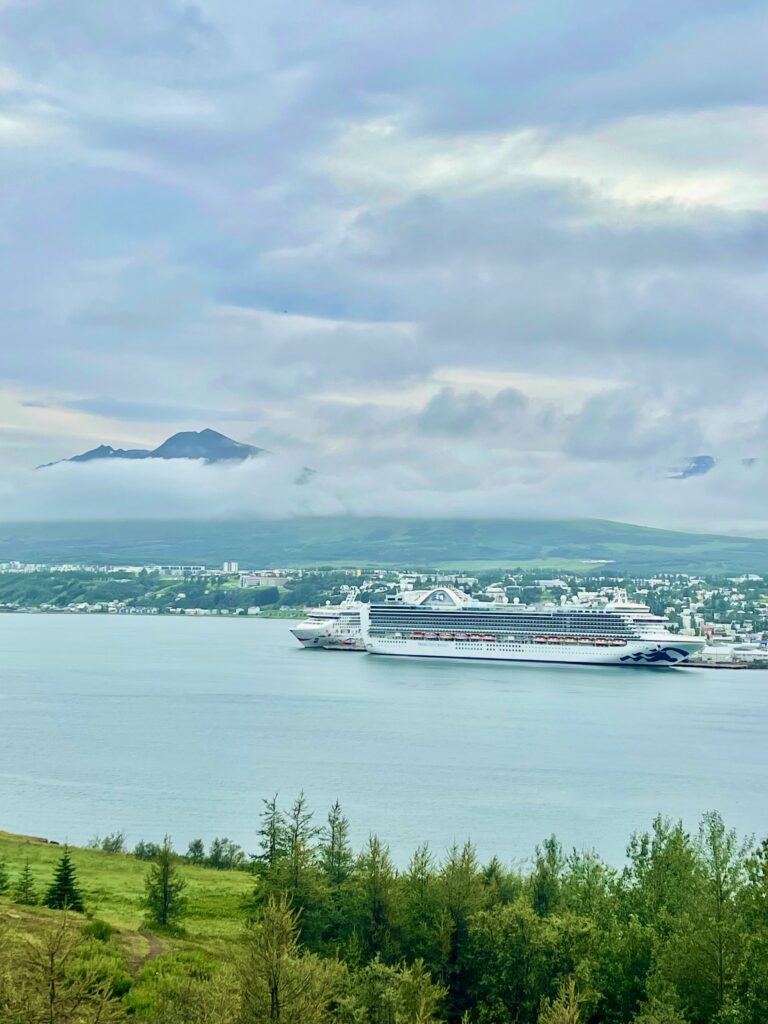 The city of Akureyri is located at the end of a fjord and is the biggest harbor town in the north of Iceland. When we almost finished the loop, we could see the town in the near distance. What surprised us right away, was the 3 very big cruise ships moored at the docks of the harbor.