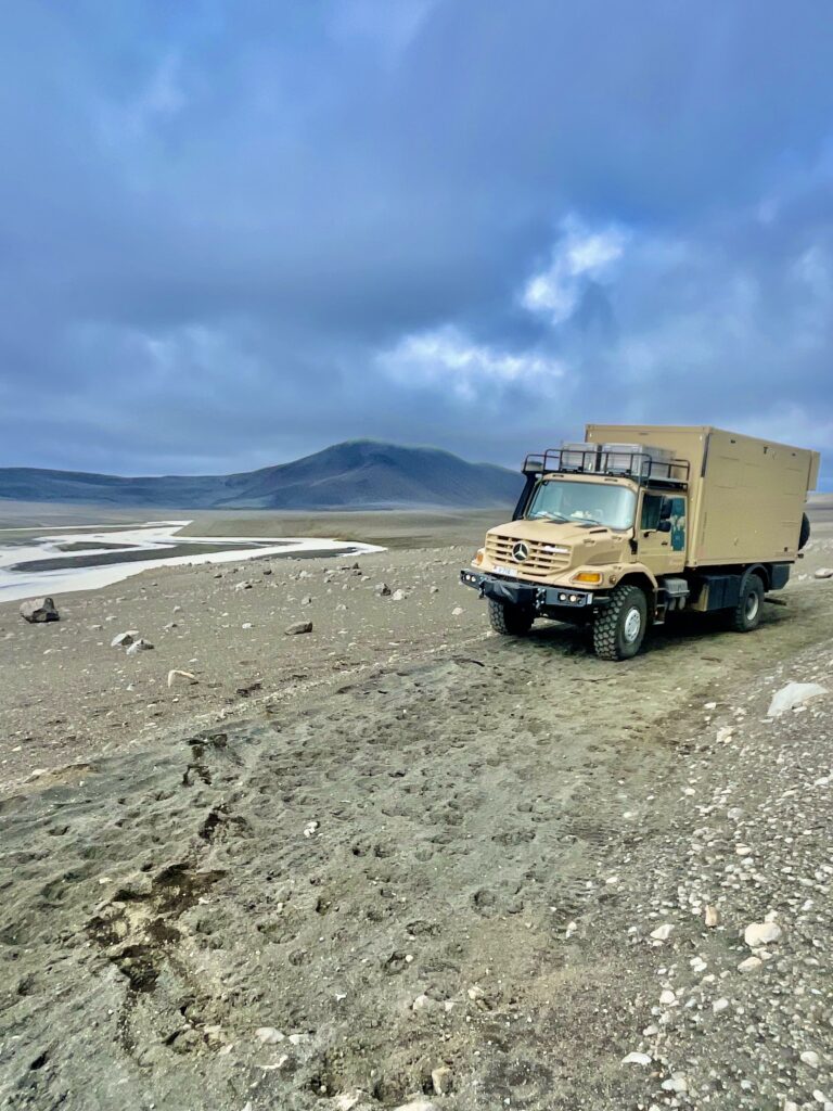 Finding a wild camp spot in the Highlands can be difficult when the road goes through lava fields without small side tracks, but at the end of the day, going back north, a track, which turned out to be a service road for the high tension power lines, provided us with a nice out of sight parking spot. The night however, turned out to be horrible. A strong (sand) storm passed over the highlands and even though we were parked behind a two meter wall of lava rock, the truck was shaking like a boat on the ocean in a storm. Besides that, through the solar panels and other equipment on the roof, the wind was hauling like a pack of wolves. We had little sleep that night…..